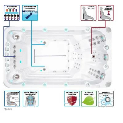 Posebnost ovog hidromasažnog bazena je River Swim System™, koji koristi pet snažnih mlaznica raspoređenih u ravnoj liniji. Time se stvara širok, ravnomjeran i snažan tok vode koji omogućuje prirodan položaj plivanja s glavom iznad površine. Sustav je u potpunosti prilagodljiv, pa korisnik može regulirati snagu mlaza. Kada se protok vode smanji, automatski se aktivira Current-Lift Technology™ – inovacija koja plivaču pomaže da ostane u horizontalnom položaju tijekom treninga.