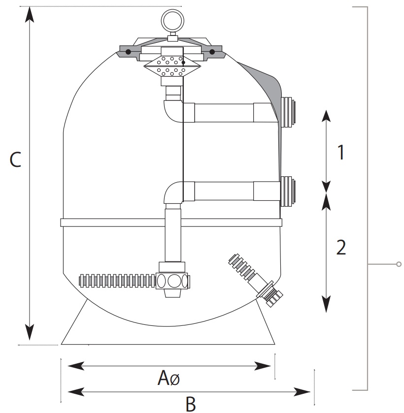 Laminirani filter od poliesterskih vlakana. Bočna montaža višeputnog ventila koji nije ukjučen u isporuku filtera. Max. Brzina filtracije 50 m3/h/m2. Max. Radni pritisak 2,5 kg/cm2