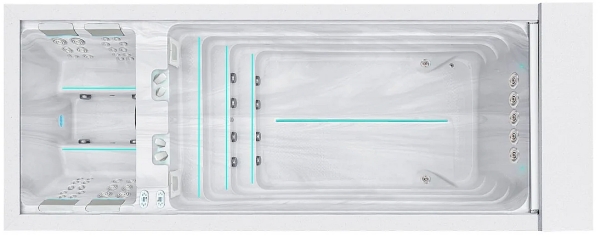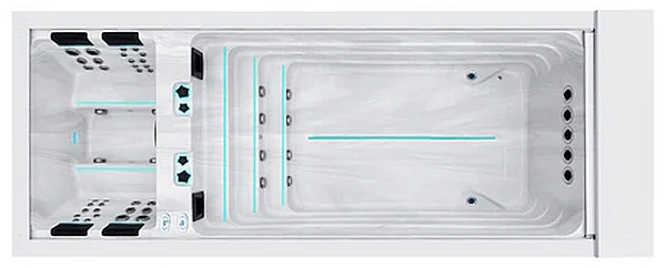 U toplom dijelu bazena, korisnike čeka ergonomski oblikovano sjedenje s dodatnom lumbalnom potporom. Iako oku nevidljiva, ta potpora znatno doprinosi ugodi korištenja, jer pruža podršku donjem dijelu leđa i smanjuje napetost tijekom opuštajućih hidroterapijskih tretmana. Ugrađeni mlazni sustavi osiguravaju ciljani učinak na mišićne skupine, što Balance model čini pogodnim za korisnike koji traže istovremeno oporavak i relaksaciju. U tom smislu, ovaj swimspa nadilazi klasične vanjske masažne bazene.