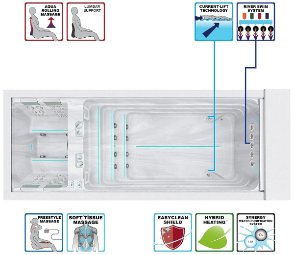 U središtu sportskog dijela nalazi se River Swim System, sustav dizajniran za plivanje protiv struje. Voda teče ujednačeno po cijeloj širini bazena, što ga čini idealnim za ozbiljno plivačko vježbanje. Kada se intenzitet protoka smanji, automatski se aktiviraju dvije Current-Lift mlaznice koje plivaču pružaju dodatnu potporu i održavaju njegov položaj u vodi. Time Balance Swimspa nudi potpunu kontrolu nad intenzitetom treninga i savršenu prilagodbu različitim sposobnostima korisnika.