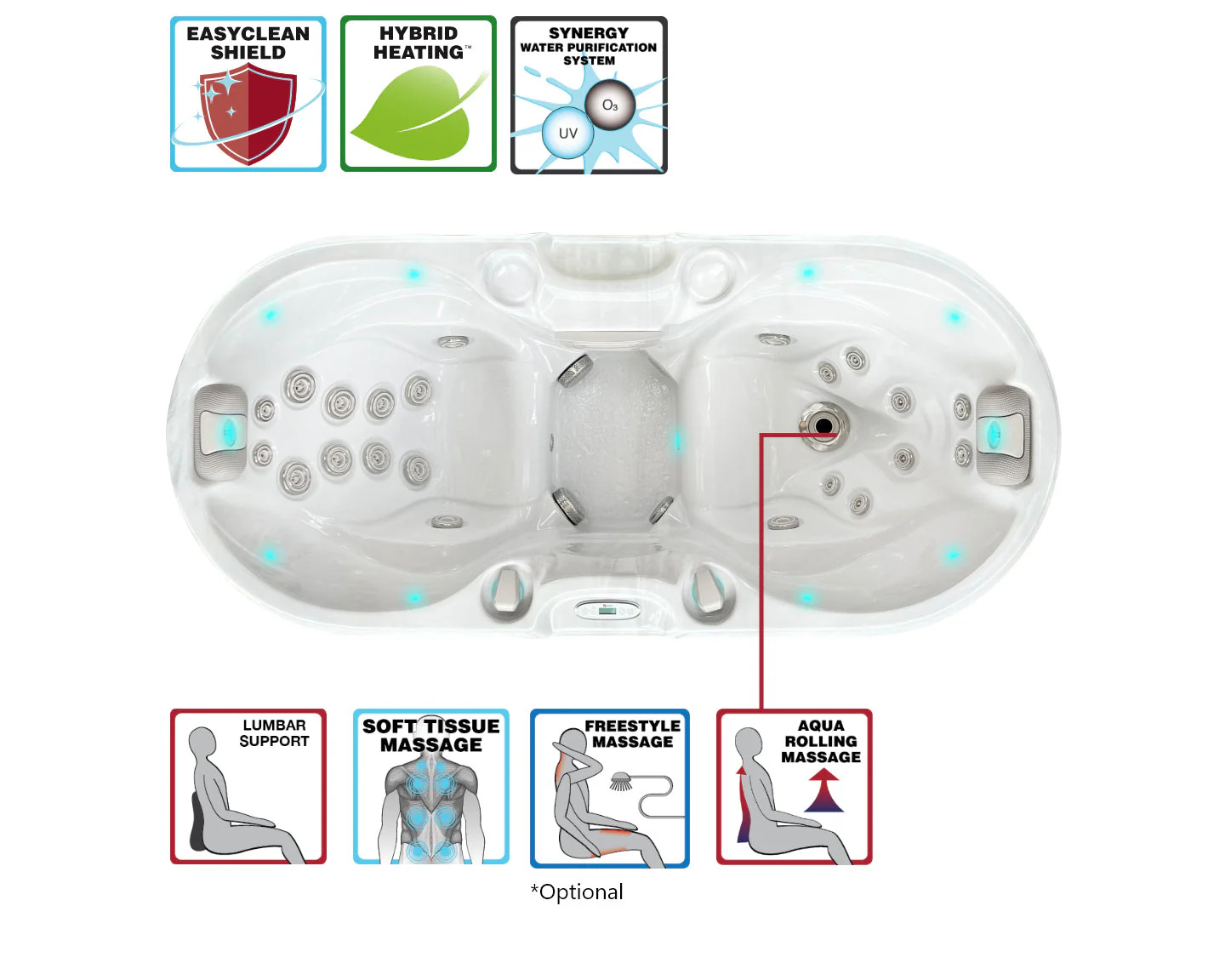 Unutar ovog elegantnog jacuzzija nalaze se dvije duboke, široke sjedeće pozicije koje pružaju dovoljno prostora i potpore za udobno opuštanje. Svako sjedalo je ergonomski oblikovano kako bi osiguralo pravilan položaj tijela i podršku tijekom masaže. Jedno od sjedala opremljeno je ekskluzivnim Aqua Rolling Massage™ sustavom, koji pruža intenzivnu masažu kralježnice pomicanjem snažnog mlaza vode duž leđa – savršeno za ublažavanje napetosti i svakodnevnog stresa.